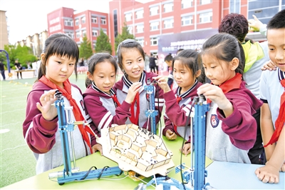 5月26日,小学生们在校园里体验科技产品。当日,2021呼和浩特市科技活动周暨第二十六届科普活动宣传周示范活动在新城区胜利街小学举行。通过零距离参观和体验,激发了同学们对科学探索的浓厚兴趣。