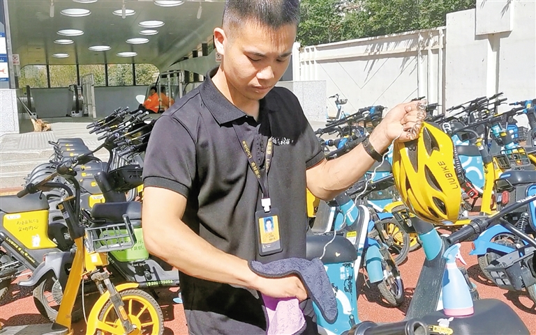 “我们每天为电单车更换电池的同时,会对车辆全身按照步骤擦拭,每辆车每天必须擦拭一遍,考虑到首府地区沙尘天气较多易积灰,同时骑行人数较多,夏天穿白衣服的人也偏多,我们对车辆的擦拭会更加频繁,尤其头盔,是擦拭重点,让市民安心佩戴。”刘浩告诉记者。