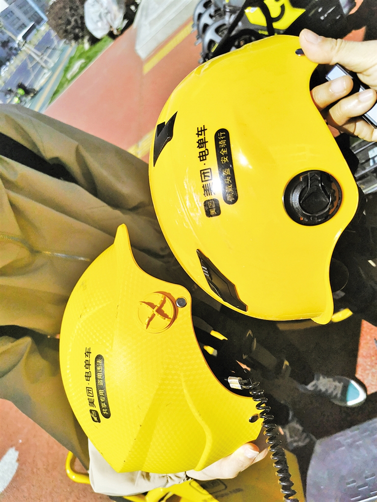 9时许,美团、小遛、哈啰电单车的工作人员陆续来到现场,统一为停放在地铁口的共享电单车配备头盔,头盔色彩与车身色彩基本一致。其中,小遛的头盔是户外骑行专用运动头盔,一体成型的网眼头盔比较抢眼,头盔里面有抗震发泡体对头部进行保护,其他电单车的头盔则是球形头盔。