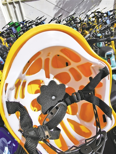 记者注意到,目前共享电单车配备的头盔以轻量型头盔为主,都配备了可调节的扣带,用一根弹力绳固定在车身上,方便骑行人佩戴。