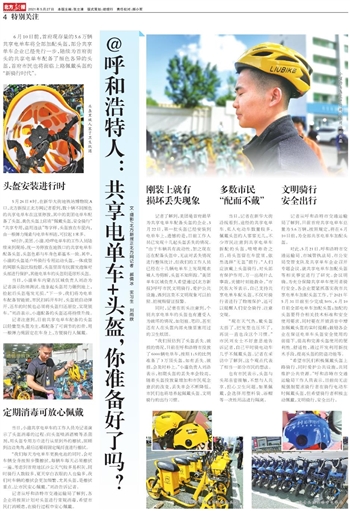 对此,5月21日,呼和浩特市交通运输局、市城管执法局、市公安局交管支队及共享单车企业召开专题会议,就共享电单车加配头盔等相关事宜进行了研究。会议明确,为充分保障共享单车使用者骑行安全,各企业要紧抓落实我市共享电单车加配头盔工作,于2021年5月31日前至少完成50%,6月10日前全部电单车加配头盔;加配的头盔要符合相关技术标准和安全使用要求,同时要在开锁语音中增加佩戴头盔的实时提醒;鼓励各企业在保证电单车头盔安全使用的前提下,提高和完善头盔使用的便利性、舒适性,通过开发利用新技术手段,提高头盔的防盗功能等。