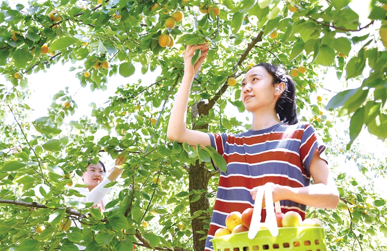 5月25日,游客在杏园采摘鲜杏。眼下,河北省邢台市南和区的鲜杏进入收获季,吸引了不少游客前来采摘。近年来,邢台市南和区积极调整农业种植结构,引导农民发展杏、油桃、葡萄等特色种植,助力农民增收。摄影/张 驰