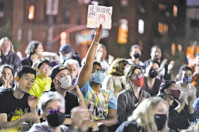5月25日,人们在美国纽约参加悼念弗洛伊德的守夜活动。当日是非洲裔美国人乔治·弗洛伊德遭明尼苏达州白人警察“跪颈”执法致死一周年,美国多地举行悼念活动。摄影/新华社记者 王 迎