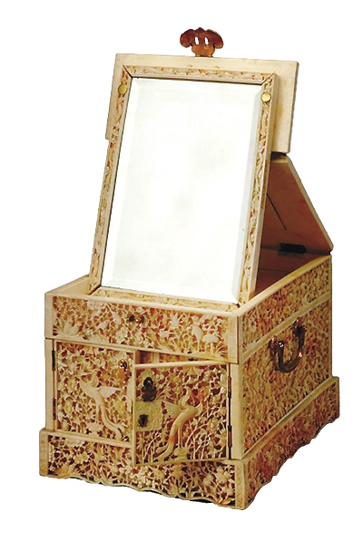清宫旧藏象牙雕花镜奁,为清晚期制作,通高19.5厘米,长29.5厘米,宽约22厘米。象牙雕花镜奁共分两层:上层为盒,内安有镶牙框的玻璃镜;下层类似小柜,双扇门,打开后为两层,分装三个抽屉,均嵌银镀金錾双桃、双鱼纹锁扣。奁盖面中心刻五龙戏珠及四龙腾云纹,四周为龙纹。奁身通体刻满花卉图案,以菊纹锦地为边框,纹饰分三层,刻有松鹤、梅菊、凤凰、牡丹和四季花鸟果实等图纹。这件作品设计新颖,布局严谨,装饰华丽,是晚清宫中后妃专用的梳妆镜奁。