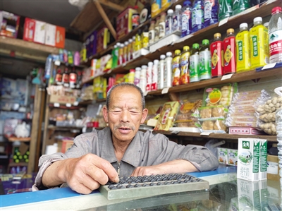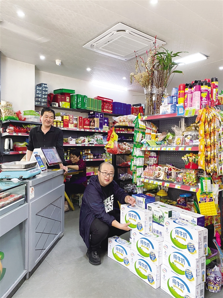上岛后,我们先来到钱方定老人开的小卖部。这家小店可能是送货的店铺中销量最少的,但对金建兵有着特殊的意义。3年前,金建兵第一次来到嵊山岛,在拜访门店时认识了钱方定。此后,每次来嵊山岛,金建兵都要去钱方定的小店转转,跟老人家用方言聊聊家常,帮老人家理理货架上的商品,十几分钟的拜访过程,更像晚辈回家探亲。虽然销售量不多,但金建兵总能保证,摆在货架上的那一两提牛奶都是新鲜的。