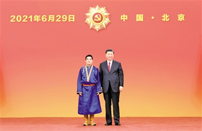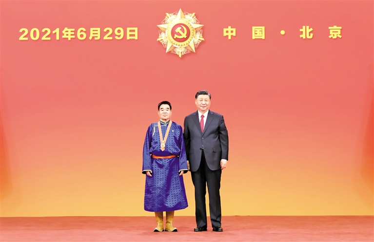 6月29日,庆祝中国共产党成立100周年“七一勋章”颁授仪式在北京人民大会堂金色大厅隆重举行。中共中央总书记、国家主席、中央军委主席习近平向“七一勋章”获得者廷·巴特尔颁授勋章。摄影/新华社记者 李学仁