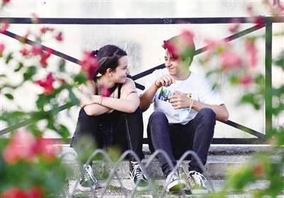 6月28日,在意大利罗马,两名年轻人坐在街边小憩。意大利28日首次实现全国范围全部划定为新冠疫情低风险地区,民众在户外可以不戴口罩。