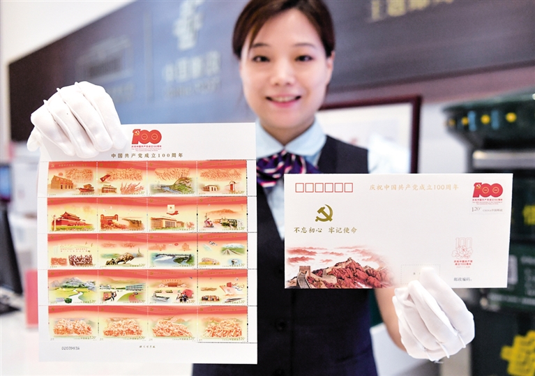 6月29日,工作人员在发布仪式现场展示《中国共产党成立100周年》纪念邮票和纪念封。当日,《中国共产党成立100周年》纪念邮票和纪念封在北京发布。中国邮政将于7月1日发行《中国共产党成立100周年》纪念邮票1套20枚,纪念封1套1枚。摄影/新华社记者 王 菲