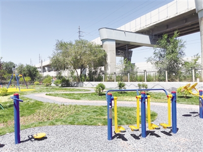 在这里,铁路桥上列车飞驰而过,桥下口袋公园与居民楼无缝对接,居民推开家门即可进入一个优美舒适的环境,有凉亭、座椅,踏步机等近十种健身器材和儿童游乐设施可供使用,古树、灌木、草坪构成一个和谐的绿地景观,石子路蜿蜒其中,引得周边居民在此漫步、嬉戏。作为首府首个开建的口袋公园,这里被取名为“妙葺园”,寓意因地制宜,巧妙修葺。
