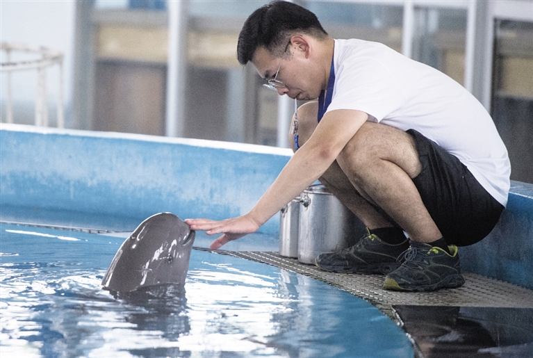 在中国科学院水生生物研究所白鱀豚馆里,生活着一对江豚母子——母豚洋洋和小江豚YYC。小江豚YYC于2020年6月3日在白鱀豚馆出生。它的妈妈洋洋今年14岁,是两岁左右从鄱阳湖移迁进白鱀豚馆的野生江豚。小江豚的爸爸淘淘是世界上第一头在人工环境中成功繁育的长江江豚,今年16岁。摄影/新华社记者 肖艺九