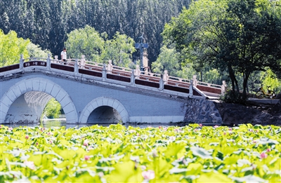 7月6日清晨,青城公园荷花池里一片青翠,粉嫩的花朵点缀其间,吸引了许多市民前来游玩赏景。 摄影/北方新报正北方网记者 牛天甲