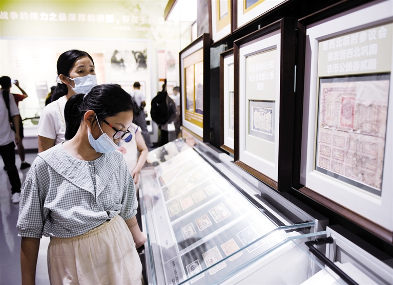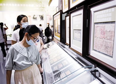 7月7日,观众在中国人民抗日战争纪念馆参观“中流砥柱——中国共产党抗战文物专题展”。为纪念全民族抗战爆发84周年,中国人民抗日战争纪念馆联合沈阳“九·一八”历史博物馆、侵华日军南京大屠杀遇难同胞纪念馆等国内60家相关主题纪念(博物)馆,共同推出“中流砥柱——中国共产党抗战文物专题展”,7月7日起向公众开放。