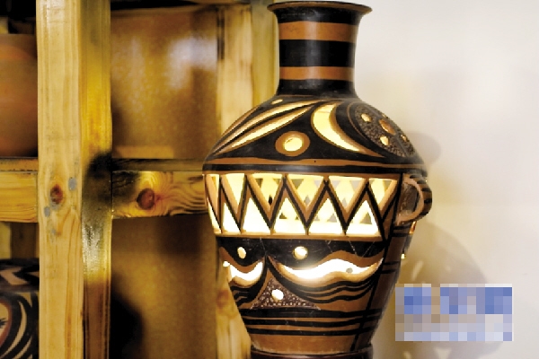 除了从古人处汲取灵感外,马黑麦还尝试创新,用彩陶制作灯具。电灯的光线从彩陶镂空处透出,似在古今之间架起一座光之桥。