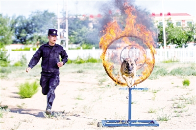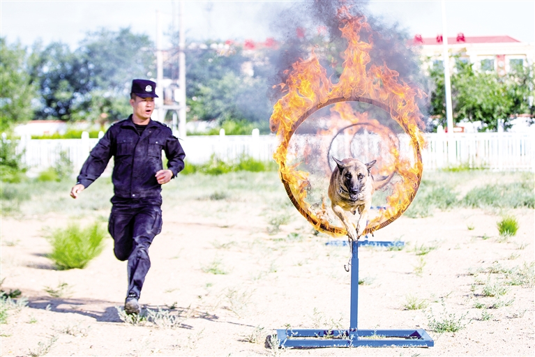 7月9日,训导员带领警犬进行跳跃火圈训练。近期,我区各地迎来高温酷暑天气,内蒙古出入境边防检查总站二连出入境边防检查站结合高温天气,组织警犬开展扑咬、通过障碍、搜毒、搜爆等专业技能训练,锤炼带犬民警及警犬过硬本领,为实战中圆满完成执法执勤任务奠定基础。文/北方新报正北方网首席记者 刘晓君 摄影/郭鹏杰