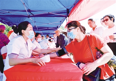 7月9日,首府市民在义诊台前测量血压并进行健康咨询。当日,2021年呼和浩特市节假日“六进”景区系列活动“传承非遗文化 守护健康生活”大型中医药宣传体验主题日活动在大召广场举行。活动旨在让更多的人了解中医药,通过中医保健、中医治疗提升健康水平,同时提高全民的健康意识。