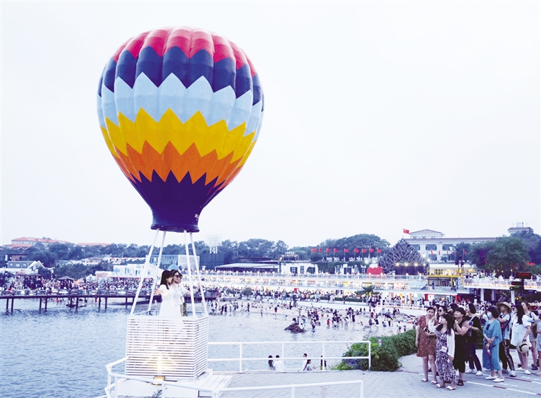 7月10日,游客在秦皇岛市北戴河区碧螺塔酒吧公园游览拍照。盛夏,避暑胜地河北省秦皇岛市北戴河区迎来旅游旺季。