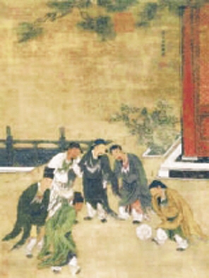 趯(音如月)鞠:看谁踢得高,且球下坠时,要用脚停住。