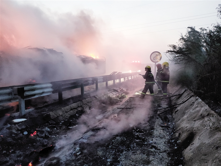 火灾发生后,赤峰市消防救援支队敖汉旗惠州街消防救援站立即出动2辆水罐消防车及6名指战员赶赴现场处置。“我们是4时05分赶到的火灾现场,看到高速路上一辆半挂车起火,车上满载木质家具,火势正处于猛烈燃烧阶段,现场浓烟滚滚,热浪逼人。”7月13日,消防员何悦齐在接受记者采访时回忆,指挥员随后立即组织人员对现场进行询问侦查,得知事发时半挂车正处于行驶途中,后方突然冒起了浓烟,紧接着就燃起了熊熊大火,司机跳车逃生。根据现场情况,指挥员果断下达作战命令,战斗小组迅速单干线出一支水枪进行灭火(如图),警戒小组对现场进行警戒防止过往车辆经过,经过约两个小时扑救,火势被完全扑灭。为防止发生复燃,指战员对火场进行彻底清查,在确认现场无复燃迹象后移交现场,收整器材返回。