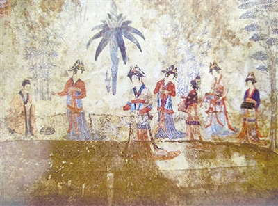 一般而言,壁画中描绘的契丹族人物笔法简练、追求写实,而以传说故事为题材的《颂经图》和《寄锦图》,以修竹、棕榈为主要背景物,画面着重传统风貌,工笔细腻、色彩浓艳,极具观赏性。这与契丹绘画风格形成了强烈对比,相较于其他辽墓壁画,具有明显的独特性。