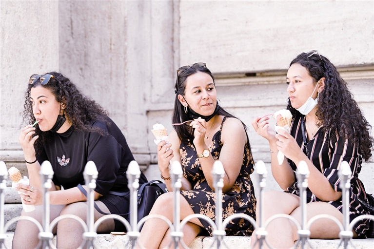7月11日,人们在意大利罗马吃冰淇淋消暑。当日,罗马最高气温达到32摄氏度。摄影/新华社记者 金马梦妮