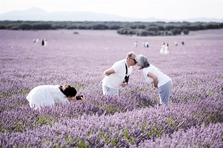 7月13日,人们在西班牙卡斯蒂利亚-拉曼查自治区布里韦加的薰衣草田拍照。每年7月,这里成片的薰衣草形成紫色的花海,吸引游客前来赏花游玩。 摄影/新华社记者 孟鼎博