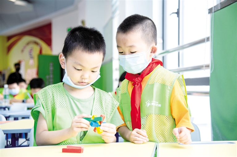 王骅介绍,漕河泾街道办学点每班配有5名大学生志愿者、2名高中生志愿者,再由街道统筹选派一名青年社工入驻,形成“5+2+1”师资模式。“暑托班不仅要带给孩子们快乐,也可以成为大学生、高中生的实践平台。”