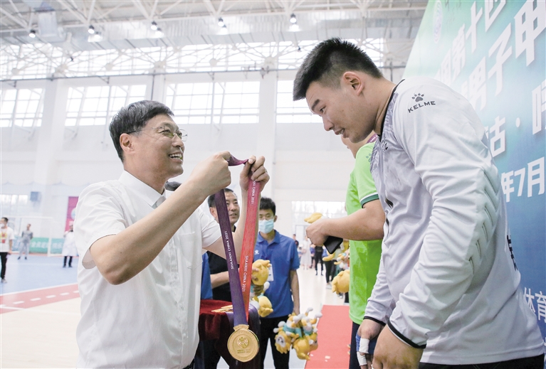 7月16日,内蒙古自治区体育局局长金满仓为冠军球员颁奖。当日,全国第十四届运动会群众比赛五人制足球男子甲组农村乡镇组决赛在呼和浩特市鸿德文理学院体育馆进行,内蒙古队在点球大战中战胜广东队,成功捧起冠军奖杯。这也是十四运内蒙古代表团获得的首枚金牌。(相关报道见6版) 摄影/北方新报正北方网记者 牛天甲