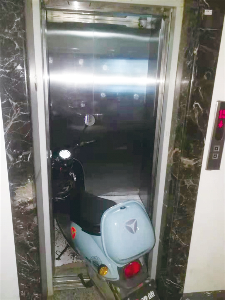 高层楼房的电梯使用率本来就频繁,狭小的电梯塞进一辆电动自行车后,严重影响他人乘坐。如此一来,自然会引起邻里不满。居住在香榭花堤小区15号楼的王女士接受记者采访时说:“我住在19楼,每天早上上班都急匆匆的。可是,有时候越着急电梯越等不来。好容易等来了电梯,却发现里面已经被电动自行车占满,根本挤不进去。没办法,只能等下一趟。有一天早晨,由于电动自行车挤占电梯,我足足等了15分钟,才下了楼,简直能把人给急死。”