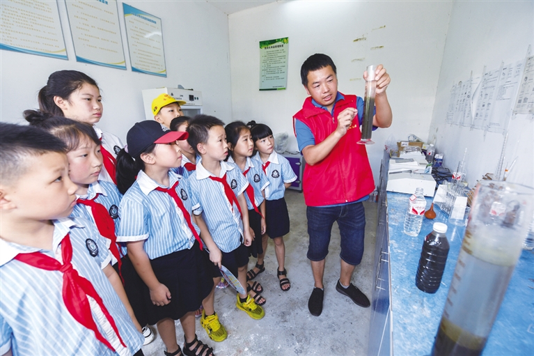 7月20日,在杭州市临安区太阳镇污水处理厂,志愿者在实验室向太阳小学的学生们介绍污水变清水的过程。暑假期间,浙江省杭州市临安区太阳镇党群服务中心组织学生开展“五水共治”主题暑期实践活动,通过实地参观污水处理厂、处理污水实验等方式,让学生们了解“污水”变“净水”的过程,增强护水、爱水的环保意识,助力生态家园建设。