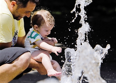 7月18日,在罗马尼亚首都布加勒斯特,一名男子抱着孩子在喷泉旁戏水纳凉。连日来,罗马尼亚大部分地区遭遇高温天气。(据新华社报道)