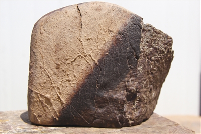 这块石头其貌不扬,但又的确与众不同。梁成光介绍说:“这是一块球粒陨石,一端略尖略扁,整体呈扁三角锥形,所以判断为定向坠落。”可能是因为一头扎入地表后不曾移动过,若干年后,陷入沙土中的部分被碱渍和锈迹包裹。