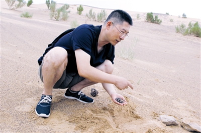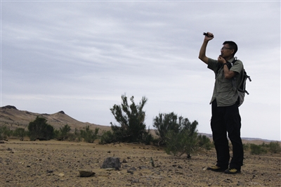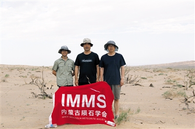 7月14日,太阳炙烤着大地。这已经是一行6人进入沙漠猎陨的第三天,地表温度高达50摄氏度。尽管天气炎热,来自内蒙古陨石学会的成员梁成光、罗明、孙永泽依然兴致不减,信心百倍。