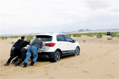 16时58分,等候在岔路口多时的牧民革命与我们见面了。简单寒暄后,他开着越野车带头驶向沙漠腹地。真正深入沙漠的搓板路后,你就会明白,驾驶一辆前驱小型SUV汽车来一次穿沙之旅,是一件多么不可思议的事情……当一处又一处流沙横亘在路上,征服它们是唯一的选择。