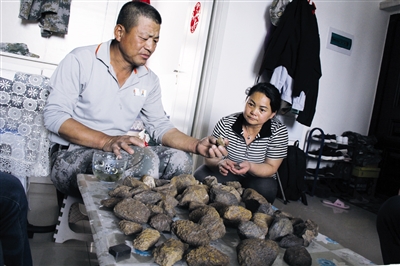 史春明称,他从小就对这种石头感兴趣,“表面坑洼、手感绵滑、分量重、颜色漂亮”是喜欢这种石头的原因,“从20岁起我就上山,往回捡这种石头,媳妇儿嫌碍事儿总给我往出扔。”20年后,当着妻子的面儿说起这事儿,史春明脸上堆着笑,“没承想现在这种石头成气候了。”如今,心有不甘的他偶尔会拿着金属探测仪在自家的老院子里或围墙上扫来扫去,“没准儿当年家里的老人就用这种石头垫了院子,砌了墙。”