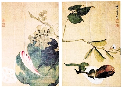 夏天各种瓜果先后成熟,花样品种丰富,清代画家袁江的《写生蔬果图页》展示了多种果蔬。此图绢本设色,纵32厘米,横22厘米,藏于中国文物流通协调中心。《写生蔬果图页》共二页,一页绘熟裂的西瓜,绿皮红瓤,形神俱备,令人垂涎欲滴。瓜皮绿中泛黄正是熟透的征象。摘瓜人为使瓜保持新鲜,特留有一截瓜藤和几片瓜叶;一页绘紫茄、白茄和青绿的豆荚,藤上小花洁白,绿叶青翠,看上去淡雅清新。这些写生作品以没骨法绘制,栩栩如生,形象逼真,尤其是一些细节勾染到位,可见作者观察生活的细腻独到。