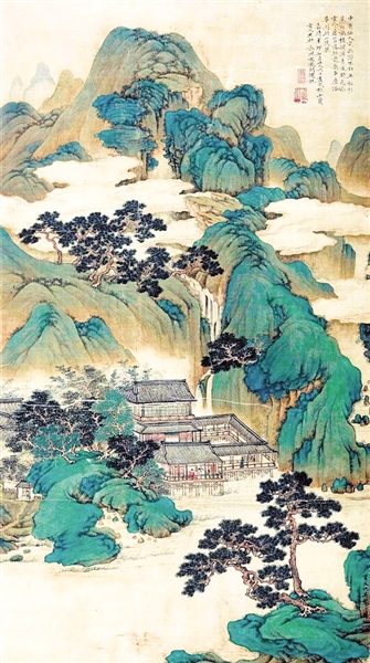 明代画家仇英的《凉亭消夏图》描绘的是在山中的凉亭中消夏的情景。画面上崇山峻岭,青峰叠翠,白云环绕,犹如仙境。山间瀑布飞流,泉水淙淙,在青松翠竹、茂密树木的掩映下,有一座豪华别墅,只见楼阁临水而建,亭廊舫榭,飞阁耸翠,或锦檐绣甍、雕栏玉砌,或翘脊高啄,钩心斗角。凉亭之上,两位身着官服之人凭栏而坐,品茗交谈,似倾听山中的阵阵松涛,又似观看眼前如练碧水,一童子侍立一旁。《凉亭消夏图》以青绿冷色调为主,青山绿水,生机盎然,观之顿觉周身凉爽,心旷神怡。从题识上看,此画作于明朝嘉靖辛卯年七月二十六日,右上有好友文徵明题记:“中有仙人宅,幽深不计年。松杉巢白鹤,楼阁涌青莲。野色孤云外,苍苔落照前。几多尘俗梦,到此一悠然。”
