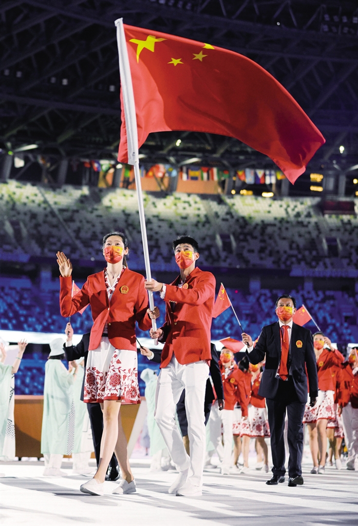 身着一身红白相间的礼服,在开幕式运动员进场环节,中国代表团由旗手女排队长朱婷和跆拳道奥运冠军赵帅带领,向着东京新国立竞技场中央走来。镜头里,这抹“中国红”在现场绚丽灯光的映衬下显得格外壮观和大气。