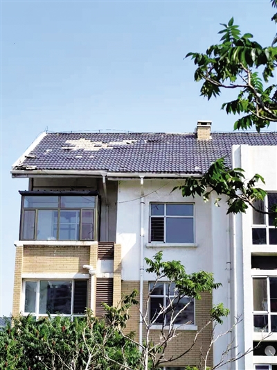 据张女士回忆,前几天东胜区刮大风,小区5号楼楼顶的瓦片被刮下来几十块。幸亏当时附近没有人,否则后果不堪设想。7月23日,记者在东方名筑小区看到,因为小区楼顶都是斜坡造型,所以在楼顶防水层的上面又覆盖了一层青色的瓦片。5号楼楼顶中间的部分有几十块瓦片已脱落。记者在小区里走访发现,小区有5栋楼存在楼顶瓦片脱落现象,另外小区内多栋楼房有墙皮脱落现象。