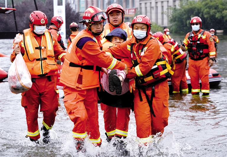 7月28日,在河南省卫辉市,消防救援人员转移被困老人。当日,河南省卫辉市的救援排涝工作仍在进行中,救援人员全力转移被困人员并进行排涝作业。摄影/新华社记者 李 安