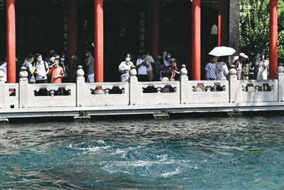 8月2日,游客在济南趵突泉畔欣赏“趵突腾空”胜景。