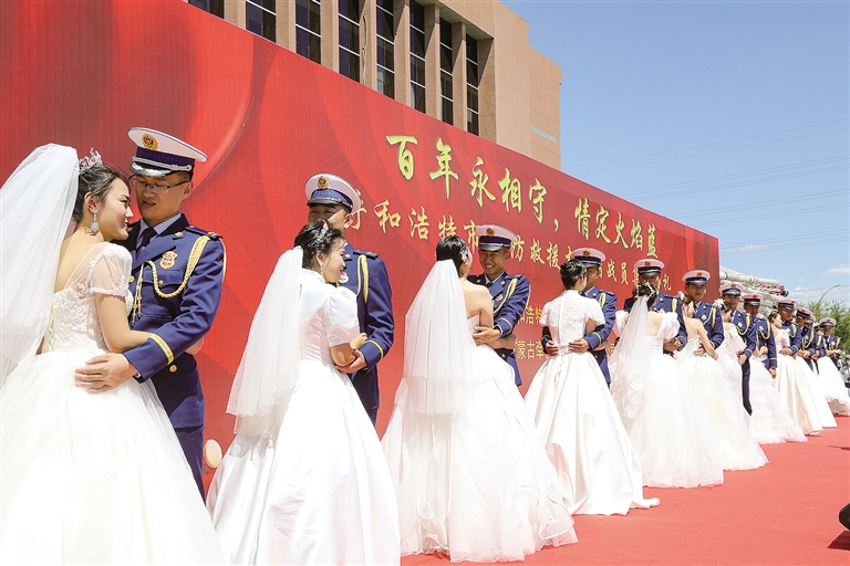 7月31日,呼和浩特市消防救援支队在特勤大队二站举办了一场别开生面的集体婚礼,13对新人分别身着白色婚纱和“火焰蓝”制服,在亲友和指战员们的祝福中许下爱的誓言。这场婚礼短视频很快火遍抖音、微博等社交媒体,不少网友大呼:这就是爱情最美的样子!(相关报道见4版)