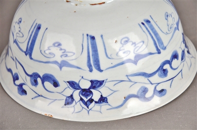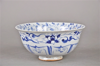 除了貘图案抢眼外,整个碗形线条流畅,极具美感。碗高8.3厘米、口径17厘米、底径6厘米,撇口、弧壁、圈足。碗施青白釉,绘青花纹饰,发色清幽淡雅。外壁有4朵莲花,纹饰颇具元代青花瓷器绘画特征,布局疏朗、手法粗放而娴熟。碗内口沿至中壁,绘有一周缠枝菊花纹,同样绘有4朵莲花,且所绘位置与外壁的莲花内外呼应。整个碗的画工十分精细,毫无粗放之感,犹如一幅立体工笔画。