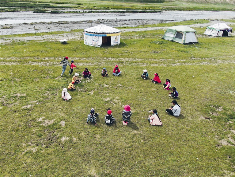 8月2日,在育苗加油站,孩子们坐在草地上玩游戏。暑假里,在青海省果洛藏族自治州玛沁县下大武乡年扎村夏季草场的育苗加油站里,孩子们唱歌、绘画、游戏,享受快乐时光。牧民转场到夏季草场之后,居住分散,放假的孩子们往往无人看管。玛沁县从2018年起开办育苗加油站,聘请暑假回乡的大学生,组织青少年开展形式多样、内容丰富的活动。摄影/新华社记者 李占轶