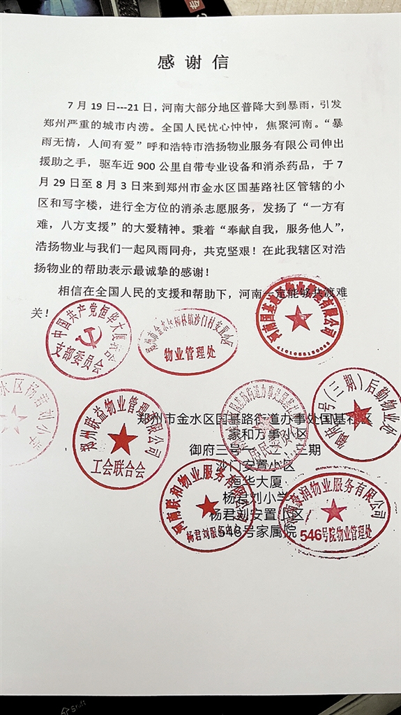新报讯(北方新报正北方网记者 张巧珍 实习生 曹泽祺) “7月19~21日,河南大部分地区普降大到暴雨,引发郑州严重的城市内涝。全国人民忧心忡忡,聚焦河南。暴雨无情,人间有爱,呼和浩特市浩扬物业服务有限公司伸出援助之手,驱车近900公里自带专业设备和消杀药品,于7月29日至8月3日在郑州市金水区国基路社区管辖的小区和写字楼,进行全方位的消杀志愿服务,发扬了‘一方有难,八方支援’的大爱精神。秉着奉献自我,服务他人,浩扬物业与我们一起风雨同舟,共克坚艰!在此我辖区对浩扬物业的帮助表示最诚挚的感谢……”8月10日,《北方新报》收到一封来自河南的感谢信,落款是郑州市金水区国基路街道办事处国基社区、家和万事小区、御府三号一、二、三期,以及沙门安置小区、恒华大厦、杨君刘小学、杨君刘安置小区和546号家属院全体居民,他们在信中称,因当时只留下了公司名称,并未留联系方式,希望《北方新报》能予以转交。 8月4日,《北方新报》刊发消息《3名志愿者到河南参与灾后防疫消杀工作》,对呼和浩特市浩扬物业服务有限公司负责人许松以及员工王国贵和马尔杰满载着消杀药品和消毒设备驱车近900公里前往郑州做消杀志愿者的事情进行了报道。