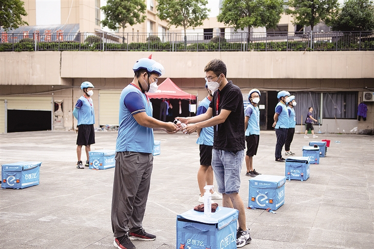 为保障隔离区内居民的正常生活,当地政府积极保障外卖、快递等服务的运营。今年22岁的燕赢召是张家界一名专职外卖员。最近一段时间,他和许多同事放弃休息,主动报名坚守一线,保障居民的食品和药品等物资运输,平均每天可送30多单。摄影/新华社记者 陈思汗