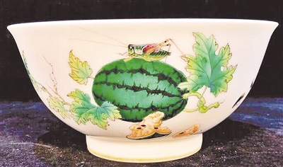 清代乾隆年间的珐琅彩西瓜纹碗。此碗口径8.2厘米,底径4.1厘米,高约7厘米,品相完美无缺。碗壁之上,瓜藤满地蔓延,瓜叶儿青翠欲滴,一只硕大的西瓜横卧在画面正中,瓜腹镶嵌着一道道墨绿色的纹线,好似裹着一条漂亮的头巾。满身油绿的叫蝈蝈从远处飞来,停留在西瓜上,高挺着两条细长的触角,蝈腹明黄,蝈翅淡红,蝈腿上的纤小绒毛也清晰可辨。碗壁下方,几块破开的瓜牙散落一地,瓜籽黝黑,瓜肉嫣红,一股隐隐的清凉甜香跃然碗上。