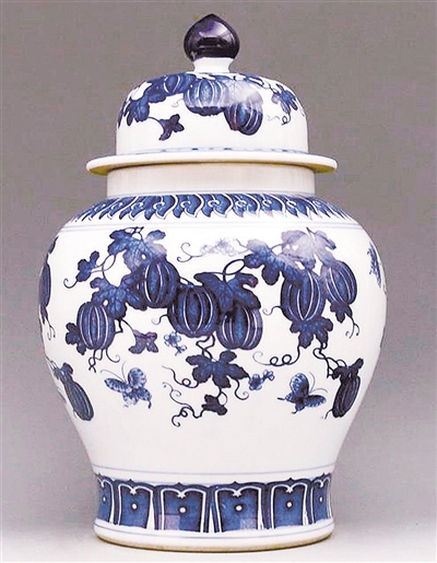 据藏友考证,这只将军罐是民国时期景德镇出品的青花瓷器。罐身为直口,丰肩,敛腹,平面砂底,附有一颗宝珠顶高圆盖。罐体青花选用了这一时期流行的贴花工艺,构图丰满工整,青花料和釉色的搭配映衬也使其显得超凡脱俗。(据《西安晚报》)