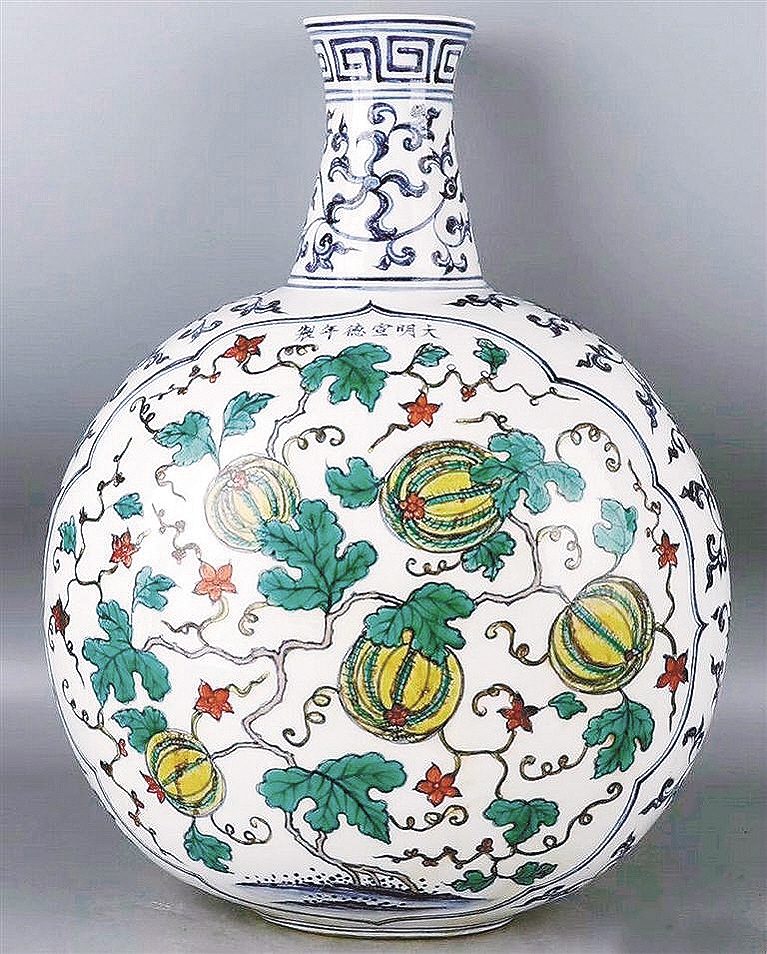 明代宣德五彩扁瓶。这只扁瓶器型硕大,高约45厘米,腹径37厘米,底径17厘米,造型端庄大方,胎体坚硬,釉色莹润。瓶颈及瓶侧布满了寓意吉祥的青花纹饰,发色纯正,布局严谨。瓶腹顶端,自右向左横书“大明宣德年制”六字楷体款识,笔法清丽秀美。藤蔓密布,花开正艳,一只只黄绿相间的西瓜吊挂在瓜秧上。有微风吹过,翠绿的瓜叶随风摆动,好一幅生机盎然的盛夏瓜田图。