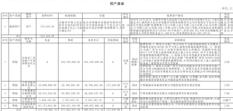 以上5户债权本息合计486,674,711.18元(其中本金114,749,895.72元,利息371,924,815.46元,利息最终以合同、生效法律文书计算为准,乌海广昊债权的债务重组收益视同为利息计算至2019年12月26日(以物抵债裁定之日),其余4户债权利息计算至2021年4月30日,5户债权涉及迟延履行期间的债务利息按有关法律规定执行);抵债资产情况详见资产清单。具体情况请投资者登陆资产公司对外网站查询或与资产公司有关部门接洽查询(http://www.gwamcc.com)。