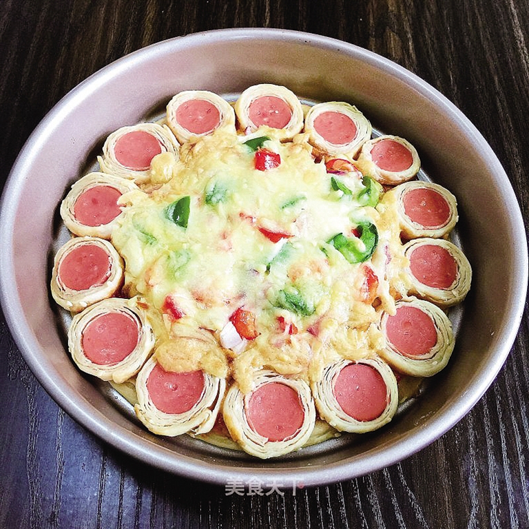 4.用刀切成片。将饼底抹上适量番茄酱。放入肠子片围边。